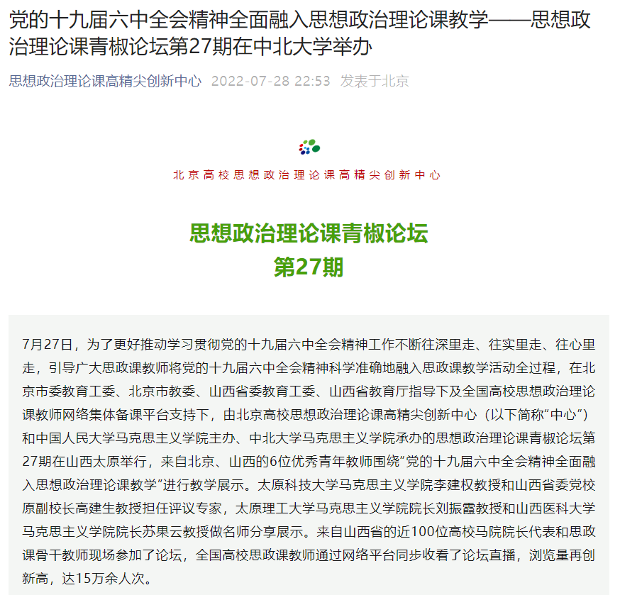 7月27日,为了更好推动学习贯彻党的十九届六中全会精神工作不断往深里走、往实里走、往心里走,引导广大思政课教师将党的十九届六中全会精神科学准确地融入思政课教学活动全过程,在北京市委教育工委、北京市教委、山西省委教育工委、山西省教育厅指导下及全国高校思想政治理论课教师网络集体备课平台支持下,由北京高校思想政治理论课高精尖创新中心(以下简称“中心”)和中国人民大学马克思主义学院主办、中北大学马克思主义学院承办的思想政治理论课青椒论坛第27期在山西太原举行,来自北京、山西的6位优秀青年教师围绕“党的十九届六中全会精神全面融入思想政治理论课教学”进行教学展示。太原科技大学马克思主义学院李建权教授和山西省委党校原副校长高建生教授担任评议专家,太原理工大学马克思主义学院院长刘振霞教授和山西医科大学马克思主义学院院长苏果云教授做名师分享展示。来自山西省的近100位高校马院院长代表和思政课骨干教师现场参加了论坛,全国高校思政课教师通过网络平台同步收看了论坛直播,浏览量再创新高,达15万余人次。