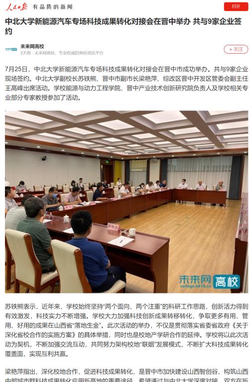 7月25日,中北大学新能源汽车专场科技成果转化对接会在晋中市成功举办。共与9家企业现场签约。中北大学副校长苏铁熊、晋中市副市长梁艳萍、综改区晋中开发区管委会副主任王高峰出席活动。学校能源与动力工程学院、晋中产业技术创新研究院负责人及学校相关专业部分专家教授参加了活动。