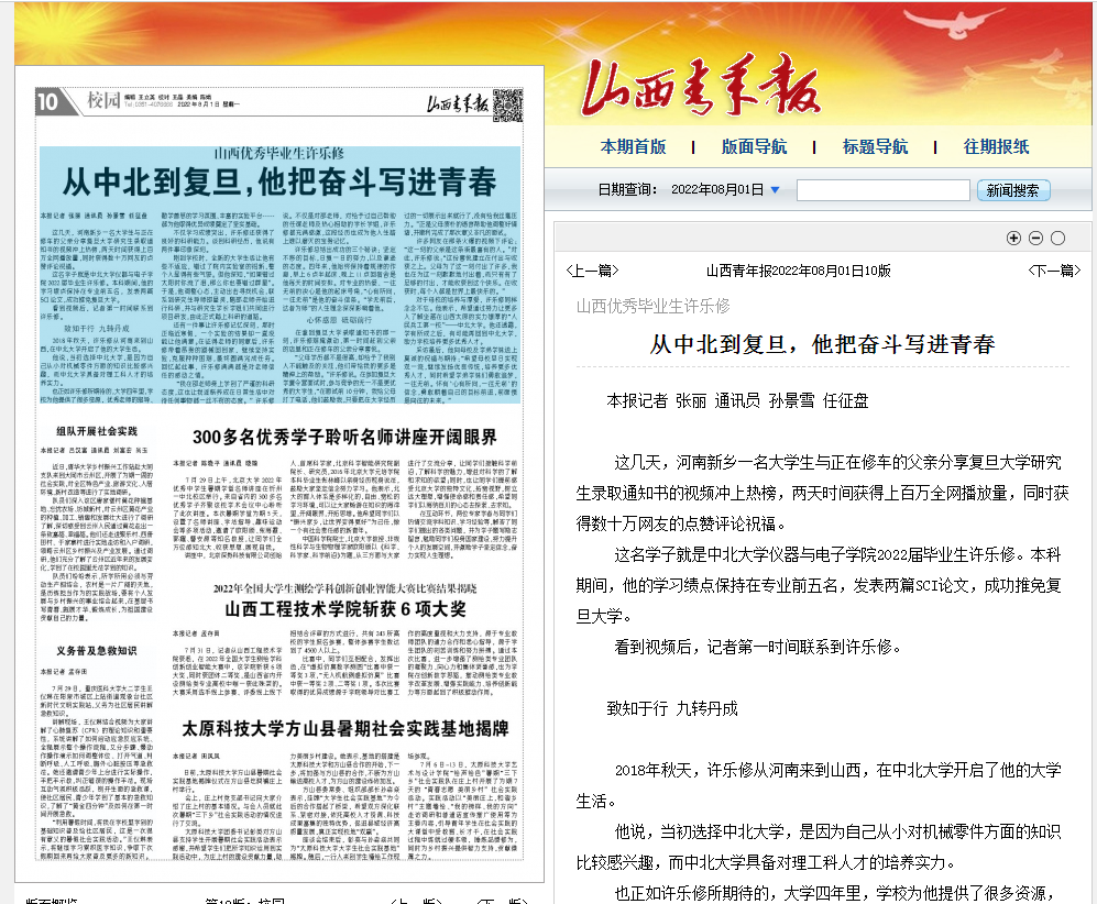 这名学子就是中北大学仪器与电子学院2022届毕业生许乐修。本科期间,他的学习绩点保持在专业前五名,发表两篇SCI论文,成功推免复旦大学。