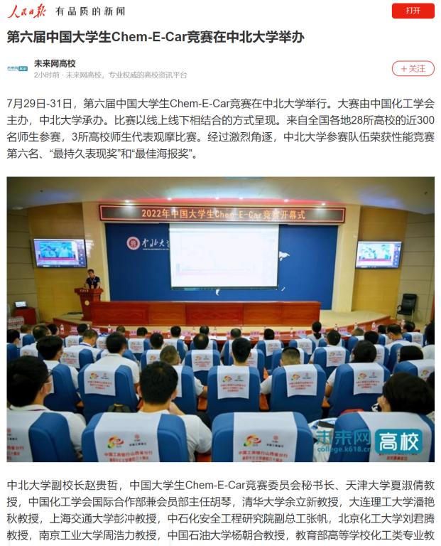为了锻炼和提高中国大学生运用化学工程技能和跨学科应用的综合能力,由天津大学发起,中国化工学会和教育部化工类专业教学指导委员会共同引入Chem-E-Car竞赛,并于2017年成功举办第一届中国大学生Chem-E-Car竞赛,迄今已连续举办六届。(通讯员:中北大学 郭艳霞)