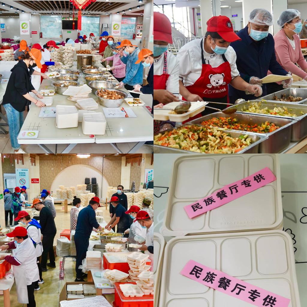 突如其来的静默,使学校后勤部门首当其冲经受了最大的挑战和考验。不足500人的餐饮队伍,要保障近4万名在校学生一日三餐第一时间做好并送到位,困难可想而知。由于学生体量大,加上配送车辆、人员短缺,静默首日出现送餐延时等情况。为确保全校学生在静默管理期吃饱吃好,学校认真听取学生的意见和建议,及时调整静默期间关于学生餐饮供应的政策和措施。全体后勤人紧急动员,餐饮服务中心每日2次开会总结当日供餐情况,严抓食品卫生安全,随时调整分配供餐办法,确保供餐流程精简高效。针对特殊就餐人群,将民族餐点对点送到每个公寓楼。隔离宿舍餐盒装配好后,由学院志愿者领餐发放。晚上0:00,餐饮员工从各食堂到物流配送中心帮助接收物资,加工至凌晨2:00。早上5:00又投入到早餐加工工作中,14:00午餐结束,继续开始准备晚餐,直至第二天凌晨,400余名后勤一线员工几乎全天无休。