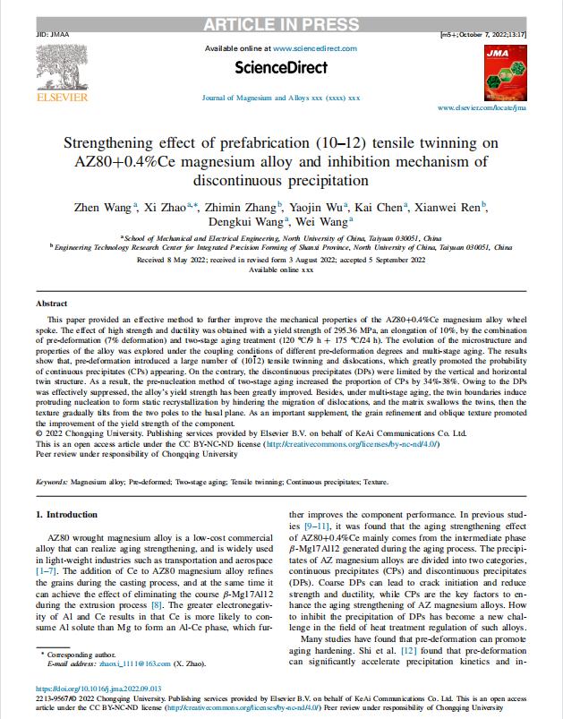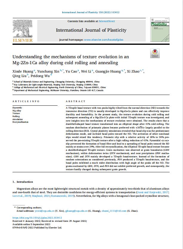 在我校A类学科建设项目资助下,我校航空宇航学院赵熹教授团队连续在国际顶级期刊发表论文。其中题为“ Understanding the mechanisms of texture evolution in an Mg-2Zn-1Ca alloy during cold rolling and annealing”发表在塑性力学国际顶刊“International Journal of Plasticity”,系我校首次在该期刊发表,2022年影响因子8.5;题为“Strengthening Effect of Prefabrication (10-12) Tensile Twinning on AZ80+0.4%Ce Magnesium Alloy and Inhibition Mechanism of Disontinuous Precipitation Journal of Magnesium and Alloys”发表在国内(国际)顶刊“Journal of Magnesium and Alloys”,2022年影响因子11.813,位列全球冶金与冶金工程类期刊榜首。