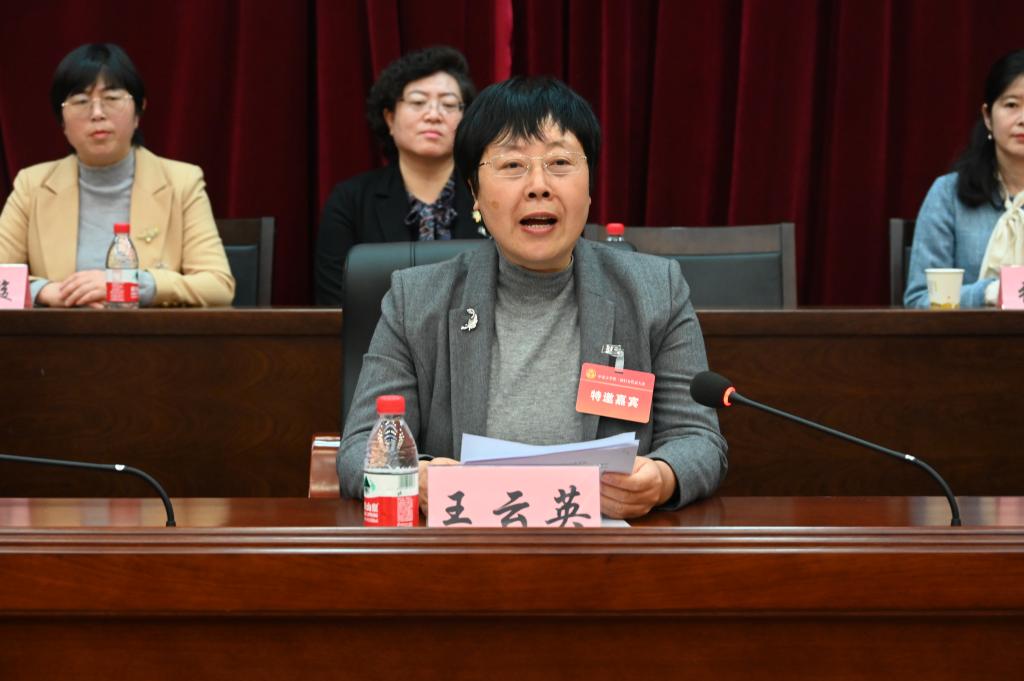 王云英代表省妇联党组对我校第一次妇代会的顺利召开、对新当选的妇联班子及班子成员表示诚挚的祝贺,向长期以来关心支持妇女工作的校领导班子和各位领导表示衷心的感谢!她希望新当选的妇联班子及班子成员要切实增强做好新时代妇女工作的责任感和使命感,紧紧围绕党的二十大提出的目标任务,围绕省委工作中心、省妇联重点工作,在校党委的坚强领导下,坚持党建带妇建,立足引领服务联系职能,坚决扛起引领高校女性听党话、跟党走的政治责任;组织动员高校女性为全方位推动我省高质量发展贡献巾帼力量;用心当好娘家人,充分发挥高校女性的独特作用,在思想政治引领、引领女性成才建功、开展维权服务、落实“三个注重”方面,团结带领全校女教职工和女大学生,进一步统一思想、凝聚共识,踔厉奋发、拼搏进取,在全方位推动学校高质量发展、创建“双一流”建设中发挥好半边天作用。