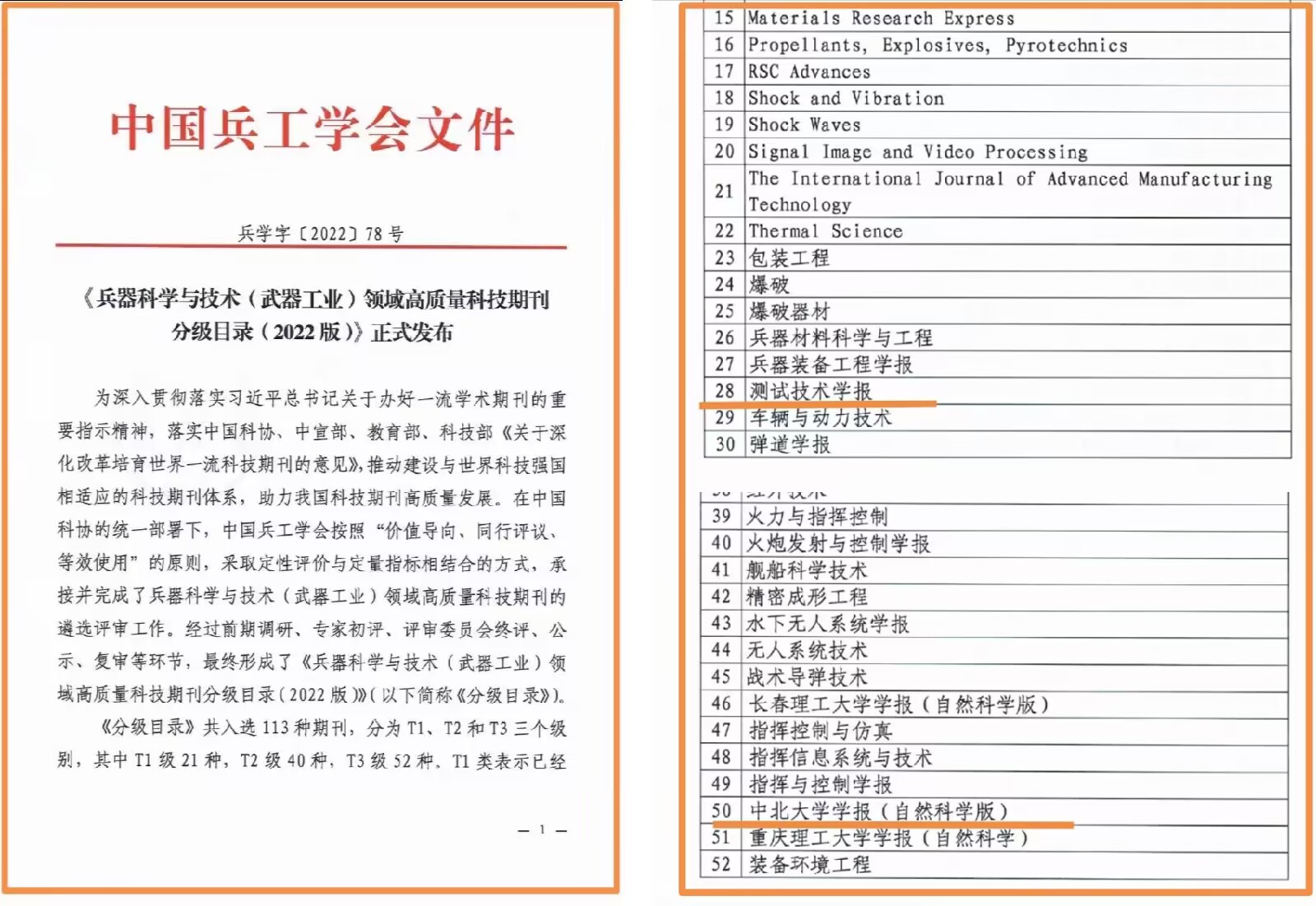 近日,中国兵工学会正式发布《兵器科学与技术(武器工业)领域高质量科技期刊分级目录(2022版)》,我校《测试技术学报》《中北大学学报(自然科学版)》入选该目录的T3级。