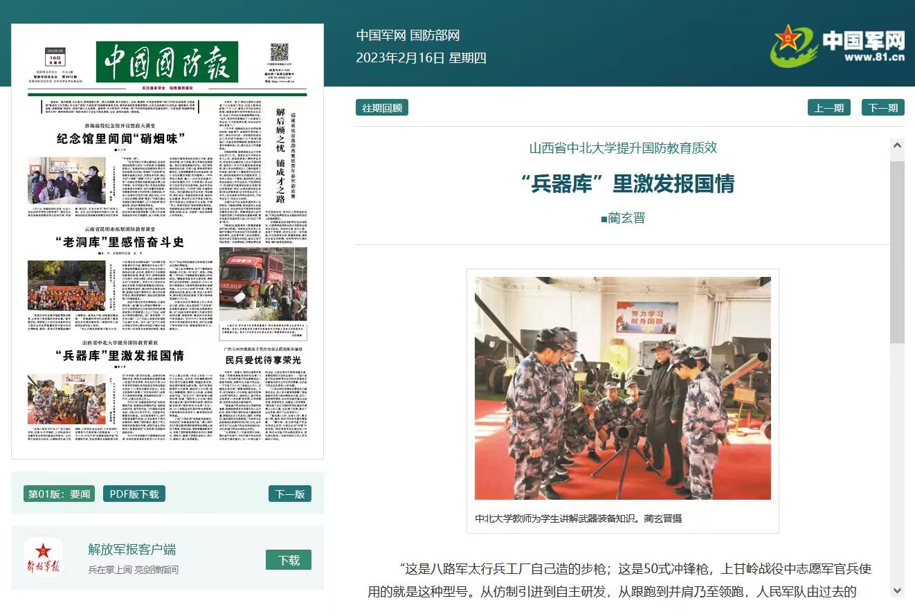 中北大学党委副书记雷锋斌告诉笔者,学校的前身是我党我军1941年在太行山上建立的第一所兵工学校——太行工业学校。近年来,学校着眼国防和军队现代化建设需要,挖掘自身优势,推动国防教育创新发展。他们浓厚校园国防文化氛围,建起军工文化园、国防人物雕塑群、国防文化长廊、兵器装备陈列室、“红色太行”国防教育主题网站等,构建“国防军工文化课+国防理论通识课+国防军事训练课+国防创新实践课+国防特色专业课”五位一体、28门课程组成的国防特色课程群,不断培固学生投身军工、献身国防的思想根基。