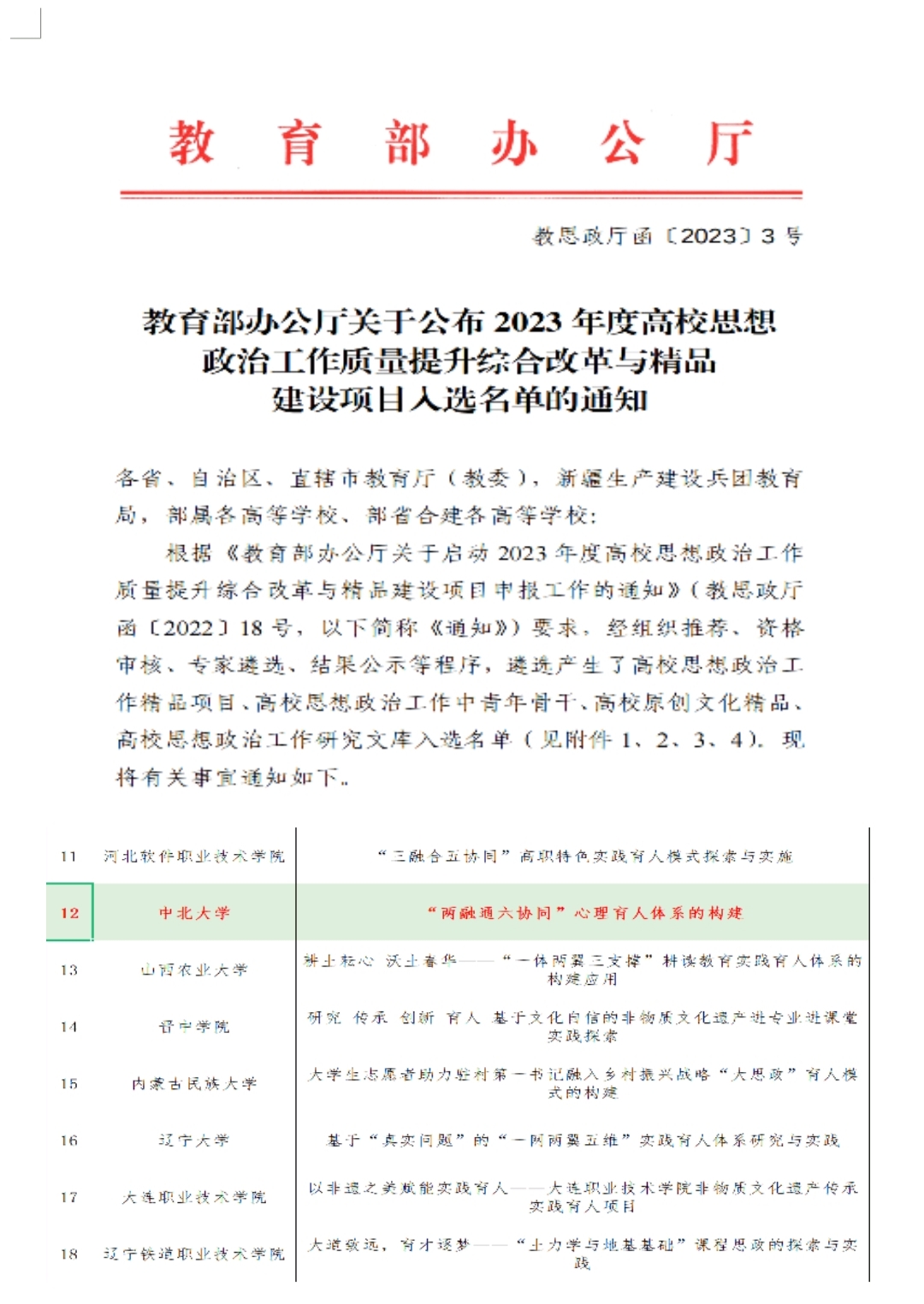 近日,教育部公布了2023年度高校思想政治工作质量提升综合改革与精品建设项目入选名单,我校申报的《“两融通六协同”心理育人体系的构建》成功入选。这是我校在思想政治工作领域获得的又一项重要成绩。