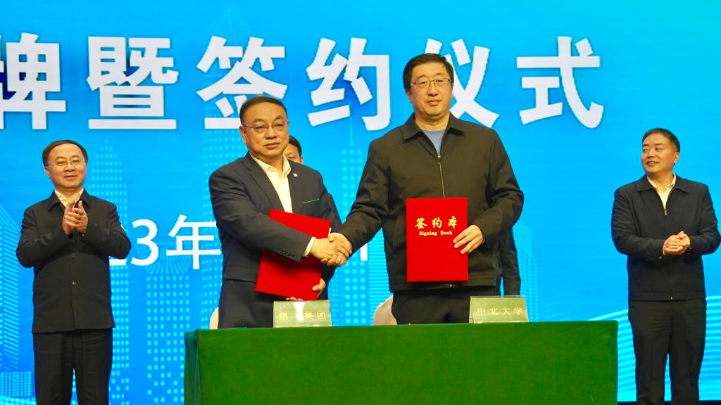 省市场监督管理局党组书记、局长鞠振,吕梁市人大常委会副主任、孝义市委书记刘世庆,吕梁市副市长任磊,副市长、市公安局局长郭红波,孝义市委副书记、市长郭清智出席活动。校党委书记沈兴全与鹏飞集团董事局主席兼总裁郑鹏共同为“先进炭基电极材料山西省重点实验室”揭牌,副校长刘俊与鹏飞集团总裁助理马小龙签订战略合作协议。