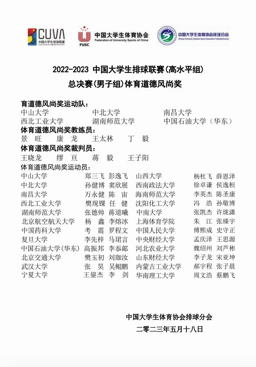 5月18日,2022-2023年中国大学生排球联赛(高水平组)男子组总决赛在江苏南通落下帷幕。来自全国南、北方赛区的24支劲旅,分四个小组进行角逐。