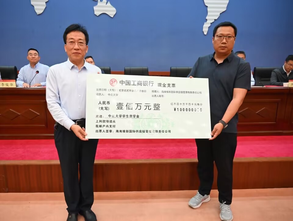 雷锋斌代表学校对海南维新国际供应链管理有限责任公司给予我校学生教育管理工作的关注关心表示感谢,向公司和郑洪波、孙召通两位先生支持和激励中北学子奋发进取的善举致以崇高敬意,也向所有获奖同学表示热烈祝贺。他表示,两位先生的义举,彰显了企业家的社会担当,是广大青年学子成长路上学习的典范。他向同学们提出三点要求:一要胸怀理想、追求进步;二要勤于学习、踔厉奋斗;三要锤炼品格、自觉担当。他希望广大学子能珍惜青春最美的时光以实际行动去实现自己的理想,创造明天的辉煌;希望更多的中北学子能够走进维新,走入企业、学习企业艰苦创业的精神、学习两位企业家勇担责任的情怀;希望维新公司和两位先生能够常来中北,现身说法、言传身教,引领广大中北学子向上向前向优奋进。