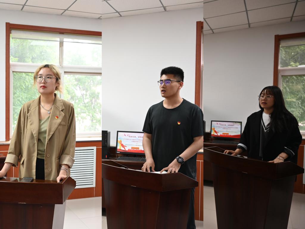 王燕介绍了前期党员自学和党小组学习情况。本次学习内容主要围绕“聚焦高质量发展”“创新驱动 科技强国”“青年学生的责任与担当”三个方面进行。按照学习计划和要求,前期已持续开展了支部党员个人自学和党小组集体学习,通过学习,每一名党员同志都反响热烈。集中学习会上,支部学生党员任相琳、徐浩浩、张丽敏结合党的二十大报告、《习近平新时代中国特色社会主义思想专题摘编》及习近平总书记系列讲话,分别以《聚焦高质量发展》《创新驱动 科技强国》《青年学生的责任与担当》为主题领学。景心怡、米嘉、刘汉浩、林金、安庆龙、关静6位同学将理论学习心得与自身科研学术成果、学习生活工作结合起来进行了分享。