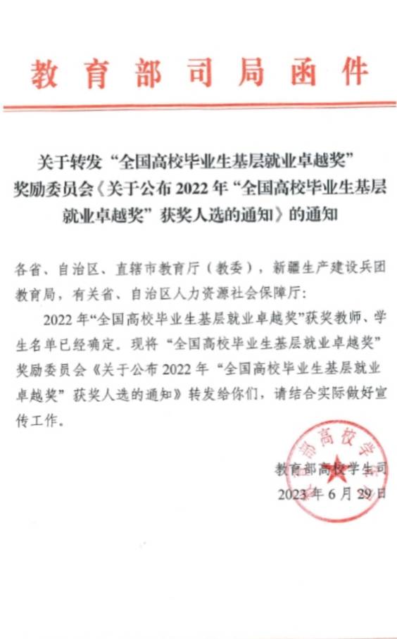 日前,教育部高校学生司、“全国高校毕业生基层就业卓越奖”奖励委员会公布2022年度全国高校毕业生基层就业卓越奖获奖名单,我校2017届本科毕业生吕伟儒入选。