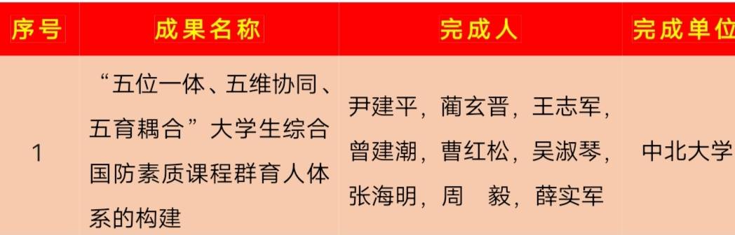 7月24日,教育部公布2022年国家级教学成果奖获奖项目名单,我校尹建平教授团队申报的《“五位一体、五维协同、五育耦合”大学生综合国防素质课程群育人体系的构建》成果荣获高等教育(本科)国家级教学成果二等奖,也是获奖成果中唯一的国防教育领域教学成果。这是我校自2008年获奖之后,时隔14年再次荣获国家级教学成果奖!