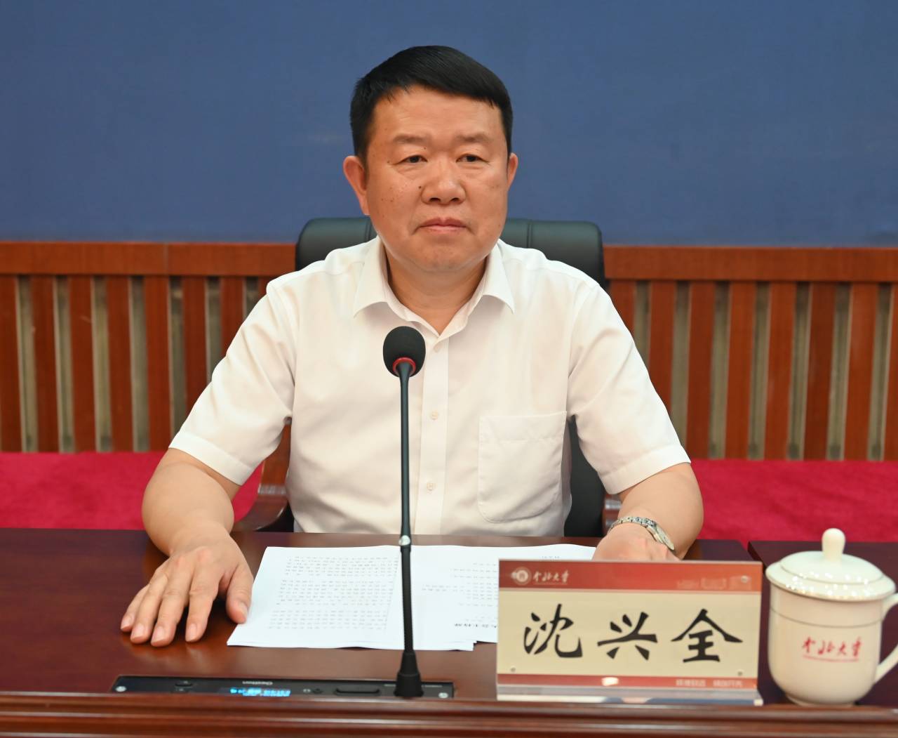 8月3日下午,我校在图书馆五层学术报告厅召开全校干部大会。副省长熊继军出席大会并讲话。省政府副秘书长胡勇,省教育厅党组书记、厅长马骏,省委组织部部务委员杨波等出席会议。全体校领导、党委常委、处级干部、二级教授参加会议。校党委书记沈兴全主持大会。