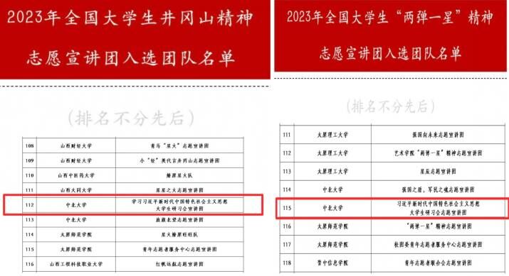 2023年,我校习近平新时代中国特色社会主义思想大学生研习会再创佳绩,成功获选团中央四项志愿团队,分别是:井冈山精神志愿宣讲团队、“两弹一星”精神志愿宣讲团队、“七彩假期”志愿服务示范团队、大学生遵义会议精神志愿宣讲团队。