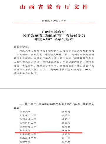 按照山西省教育厅相关文件要求,经个人申报、学院推荐、学校遴选推报、省教育厅组织专家评审,我校计算机科学与技术学院魏春燕成功入选第二届山西省“高校辅导员年度人物”,并被推荐参加教育部2023年“最美高校辅导员”评选展示。本年度全省高校共有10位辅导员获此荣誉。