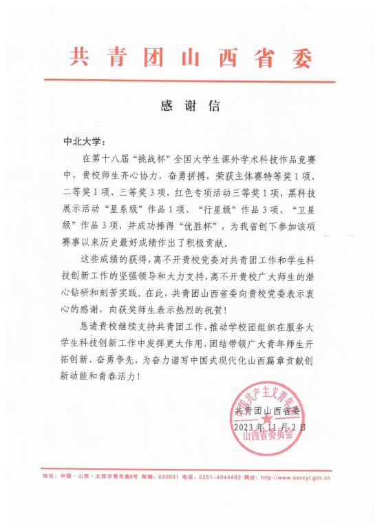 近日,共青团山西省委给我校发来感谢信,信中充分肯定了我校为我省创下参加"挑战杯"全国大学生课外学术科技作品竞赛以来历史最好成绩作出的积极贡献。对我校党委高度重视共青团工作和学生科技创新工作表示衷心感谢,对获奖师生表示热烈祝贺!