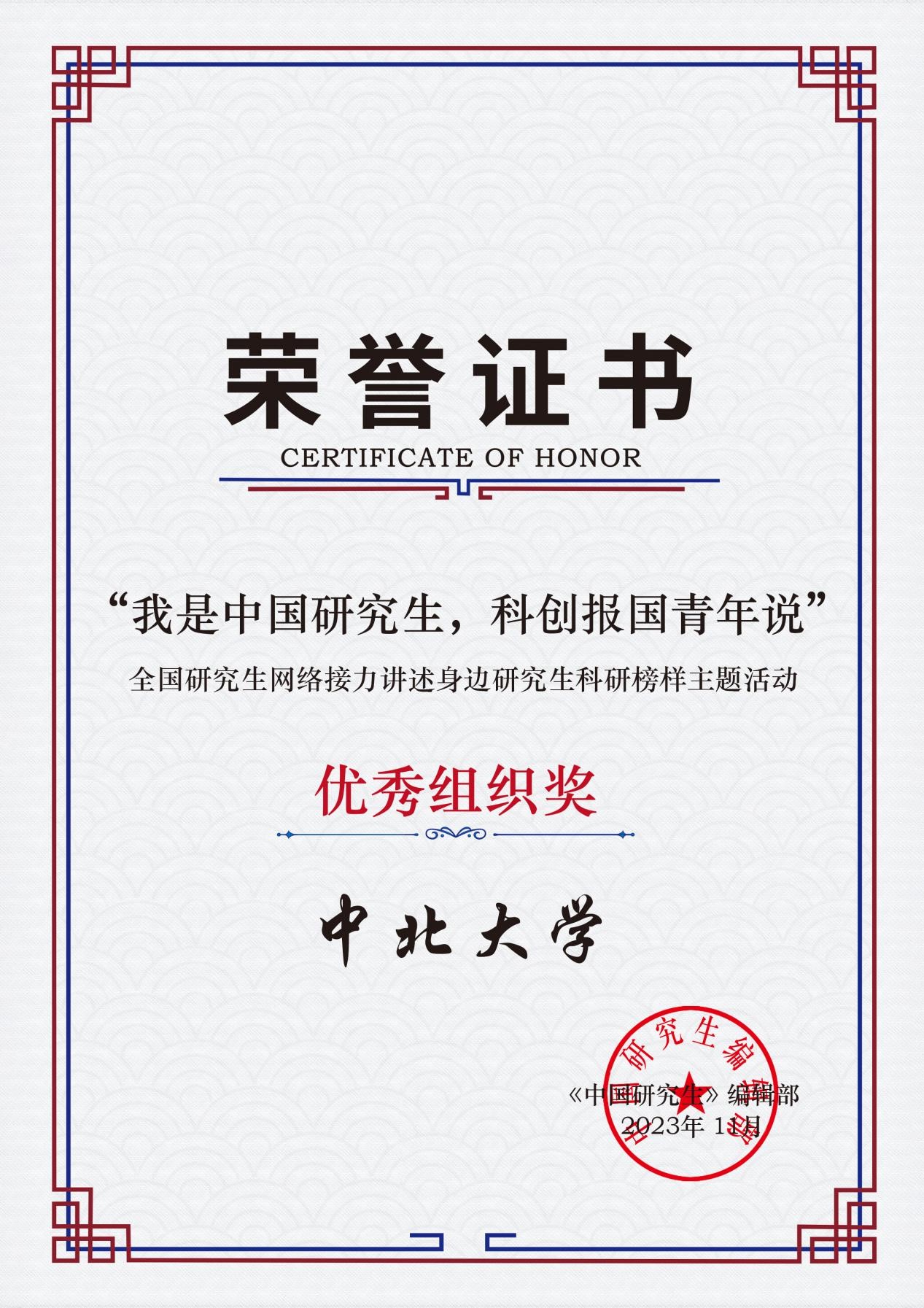 我校于2023年7月31日作为第61期网络接力高校参与了该项活动,以我校硕士研究生张锦涛作为学生代表,展示中北研究生的科创报国故事。推文上线后,中国研究生、川大研究生等媒体相继进行转发,并引起众多高校学子的广泛关注,最终阅读量高达1.5万,位居各接力高校前列,最终获评“优秀组织奖”。