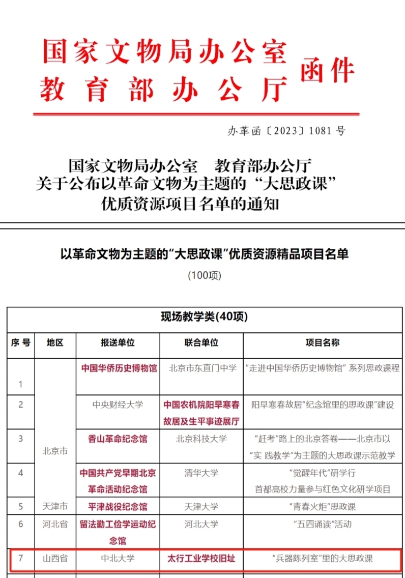 11月27日,国家文物局办公室、教育部办公厅公布了以革命文物为主题的“大思政课”优质资源项目名单,确定了10个示范项目、100个精品项目。我校申报的“兵器陈列室里的大思政课”成功入选精品项目。这是我校“大思政课”建设取得的又一重要成果。