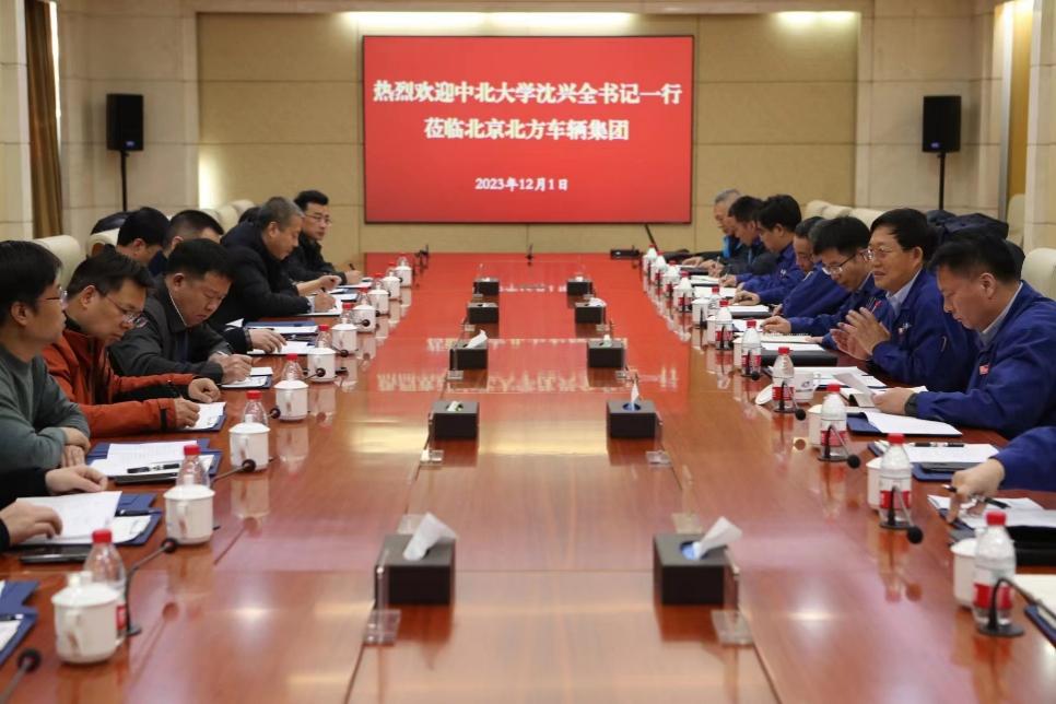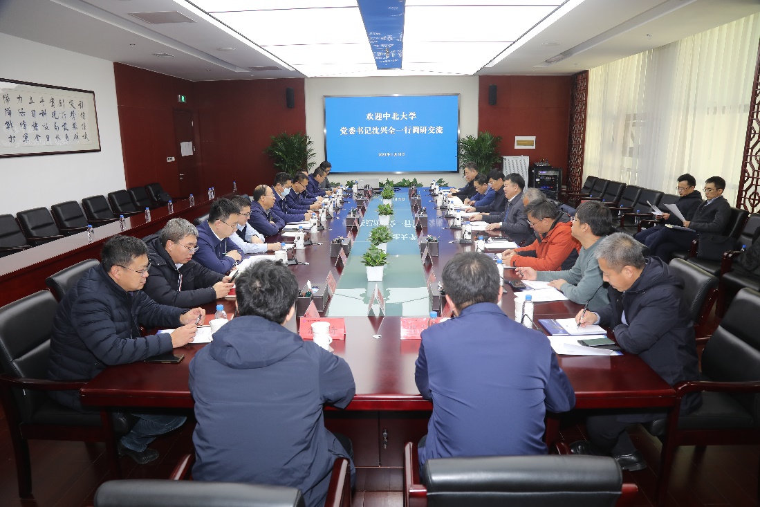 在北京北机机电工业有限责任公司,沈兴全在董事长杨文昭、总经理蒋云峰陪同下参观了公司生产车间、陈列室、数智中心等,详细了解公司生产经营、零碳园区建设等情况。座谈会上,他表示,双方合作基础扎实,有大批毕业生在北机公司就业发展。希望在前期合作基础上,继续取得新的合作成果,为国家国防军工乃至经济事业发展贡献力量。杨文昭表示,公司高度重视与中北大学的合作,希望在校企合作研发、联合人才培养、共建校内外实验实习实训基地、共建人才队伍以及其他方面与学校进一步加强沟通合作,充分发挥双方优势,促进校企双方协同发展。