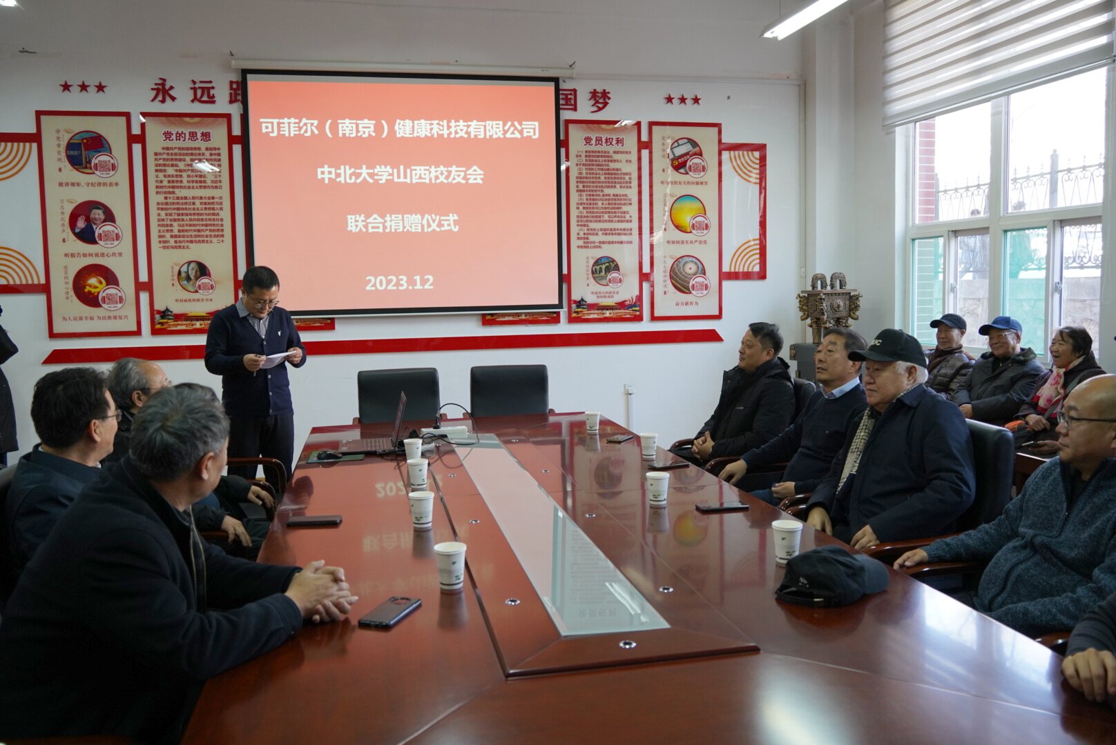 12月8日,可菲尔(南京)健康科技有限公司与我校山西校友会联合捐赠仪式在离退休人员管理部举行。副校长尹建平出席会议。山西校友会会长杨波、副会长兼秘书长曹永勤,菲尔(南京)健康科技有限公司董事长吴明光,中北大学86级校友、菲尔(南京)健康科技有限公司总经理孔斌及我校教育发展基金会、离退休人员管理部负责人参加活动。