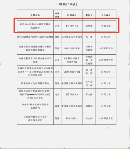 近日,山西省社会科学界联合会发布《关于表彰2022年度“百部(篇)工程”优秀成果及先进组织单位的决定》,本年度全省共有103项成果获表彰,其中一等奖19项、二等奖32项、三等奖52项。我校马克思主义学院赵笑蕾教授的《党的初心使命论的理论逻辑和政治优势》(论文)荣获一等奖。