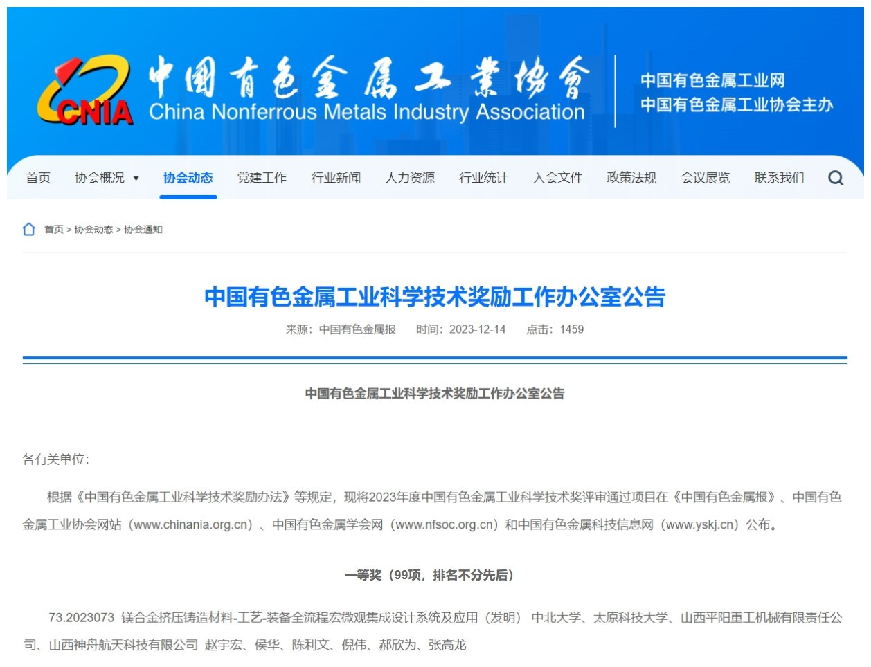 12月16日,中国有色金属工业协会公布了2023年度“中国有色金属工业科学技术奖”获奖信息,由我校材料科学与工程学院赵宇宏教授团队牵头,太原科技大学、山西平阳重工机械有限责任公司、山西神舟航天科技有限公司共同参与的“镁合金挤压铸造材料-工艺-构件全流程宏微观集成设计系统及应用”项目,获评中国有色金属工业技术发明一等奖。