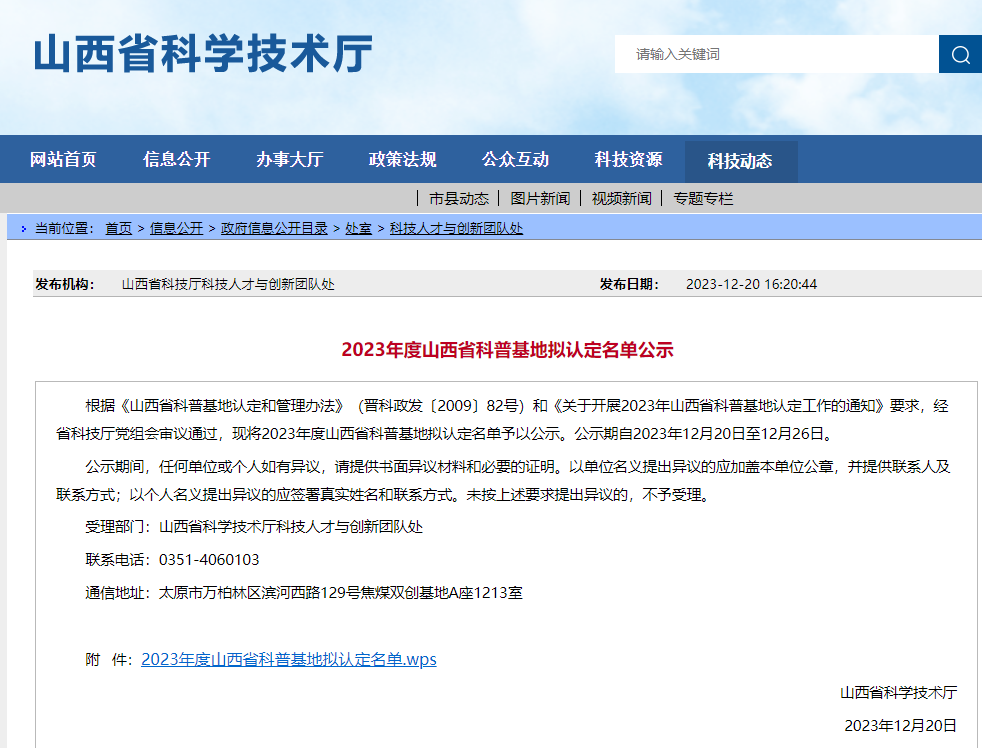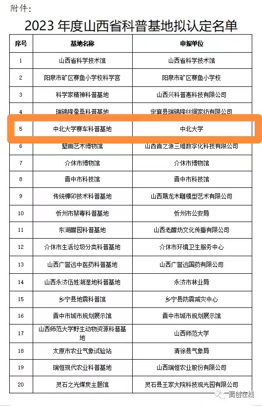 近日,根据《山西省科普基地认定和管理办法》和《关于开展2023年山西省科普基地认定工作的通知》要求,山西省科技厅公布了2023年度山西省科普基地认定名单。通过公开申报、专家评选等环节,全省共有32家单位被确定为省级科普基地,由我校能源与动力工程学院、创新创业学院联合申报的中北大学赛车科普基地成功入选。