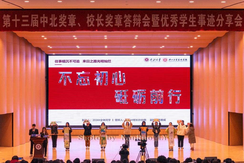 经个人申请、学院推荐、网络投票环节,共有21个优秀班级、45个优秀个人参加答辩。由校学生工作领导组成员、教师代表及学生代表组成的评审团进行现场评审,经评审,20050Z01班、20060146班、20140Z01班、20020241班、20070141班、20010S01班、20120344班、20150343班、20090443班、20010Z01班荣获中北奖章;仪器与电子学院侯帅鹏、人文社会科学学院张梦溪、电气与控制工程学院田梓颖、体育学院潘晋辰、数学学院桂蕴嘉、仪器与电子学院谢宏飞、艺术学院叶凡、材料科学与工程学院张世成、信息与通信工程学院宋柳依、人文社会科学学院白亮荣获校长奖章。