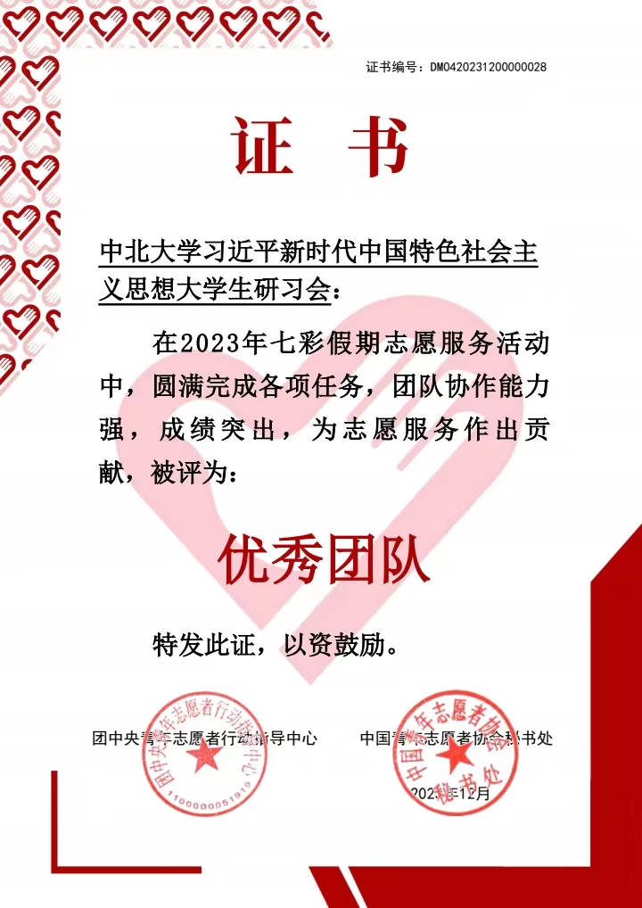 近日,团中央公布2023年“七彩假期”志愿服务优秀团队,经过对1000支示范团队总结材料的审核,共评选出100支优秀团队,中北大学习近平新时代中国特色社会主义思想大学生研习会位列其中。前期团中央青年志愿者行动指导中心、中国青年志愿者协会秘书处发布了《关于遴选2023年“七彩假期”志愿服务示范团队的公告》。全国范围内各志愿服务团队踊跃报名,全国3762支志愿服务团队提交了申报材料,最终共遴选了1000支示范团队。