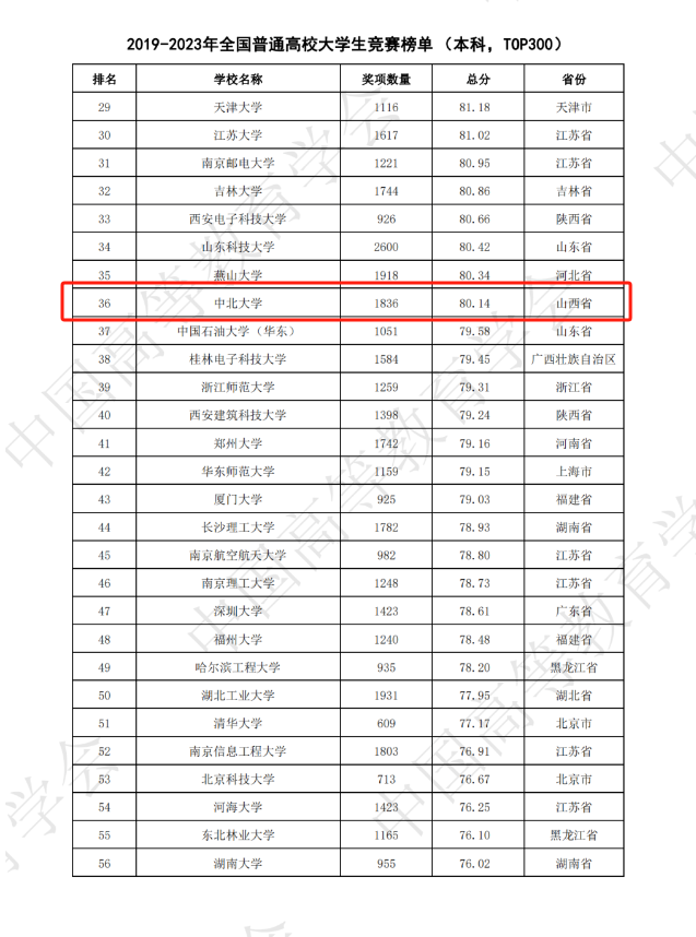 3月22日,教育部中国高等教育学会发布全国普通高校大学生竞赛第八轮榜单,我校表现出色,以奖项数量525项、总分83.5分的优异成绩在2023年全国普通高校大学生竞赛榜单(本科,TOP100)中位列全国第20位、山西省首位;在2019-2023年全国普通高校大学生竞赛榜单(本科,TOP300)位列全国第36位。