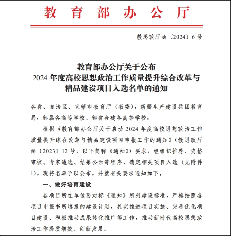 据悉,教育部2024年度高校思想政治工作质量提升综合改革与精品建设项目旨在深入学习贯彻习近平新时代中国特色社会主义思想和党的二十大精神,加快构建落实立德树人根本任务新格局,推动各地各高校落实“时代新人铸魂工程”,培养担当民族复兴大任的时代新人。