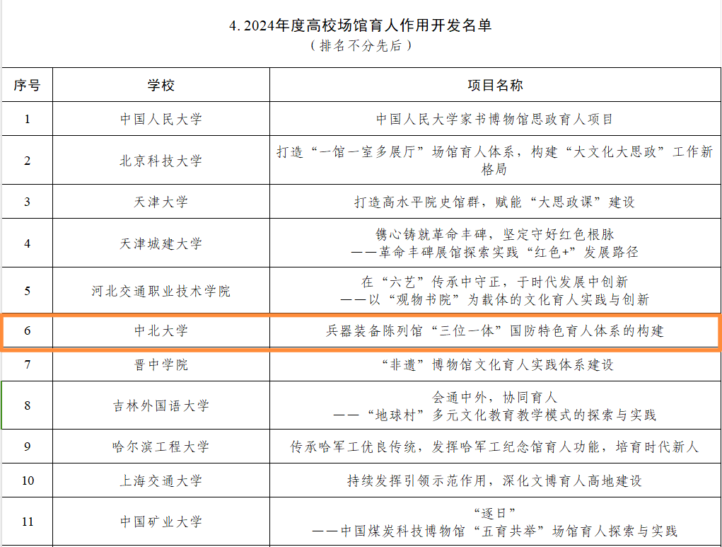 近日,教育部办公厅下发了《关于公布2024年度高校思想政治工作质量提升综合改革与精品建设项目入选名单的通知》(教思政厅函[2024]6号),我校尹建平教授牵头申报的《兵器装备陈列馆“三位一体”国防特色育人体系的构建》入选2024年度高校场馆育人作用开发项目名单(全国共30项)。