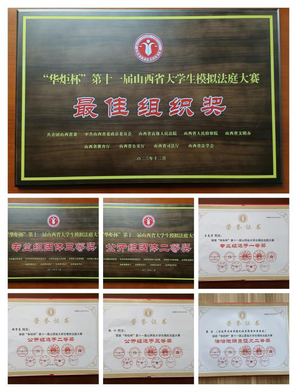 近期,共青团山西省委、中共山西省委政法委员会、山西省高级人民法院、山西省人民检察院等多家单位联合下发《关于“华炬杯”第十一届山西省大学生模拟法庭大赛的表彰决定》并颁发奖牌与荣誉证书,我校荣获最佳组织奖、专业组团体三等奖和公开组团体二等奖,5名同学荣获奖项,人文社会科学学院刘丹老师荣获“最佳导师奖”,9名同学荣获法治微调查征文奖。