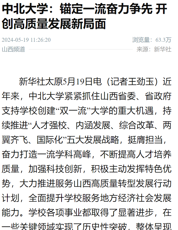 文章指出,中北大学紧紧抓住山西省委、省政府支持学校创建“双一流”大学的重大机遇,持续推进“人才强校、内涵发展、综合改革、两翼齐飞、国际化”五大发展战略,挺膺担当,奋力打造一流学科高峰,不断提高人才培养质量,加强科技创新,积极主动发挥特色优势,大力推进服务山西高质量转型发展行动计划,全面提升学校服务地方经济社会发展能力。学校各项事业都取得了显著进步,在一些关键领域实现了历史性突破,整体呈现出快速向上向好的发展势头,综合办学实力、学术声誉和影响力大幅提升。