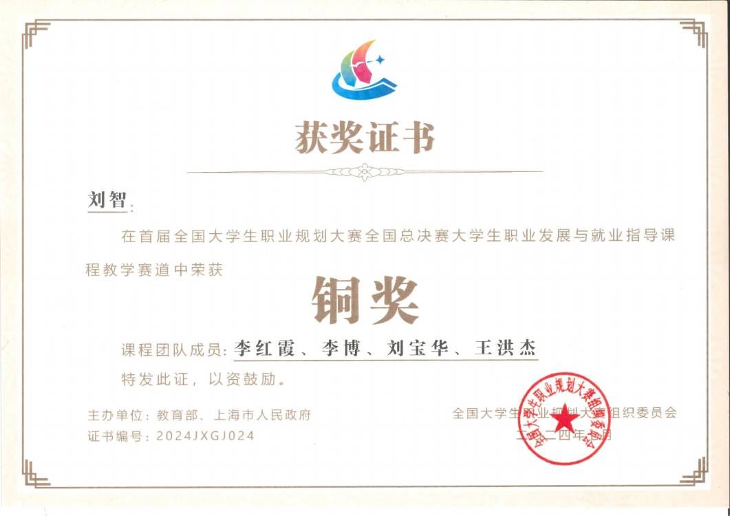 近日,教育部正式公布首届全国大学生职业规划大赛全国总决赛获奖名单。我校仪器与电子学院2021级本科生谢宏飞、能源与动力工程学院2021级本科生许匡渊分获高教组成长赛道铜奖,教师刘智荣获课程教学赛道铜奖。
