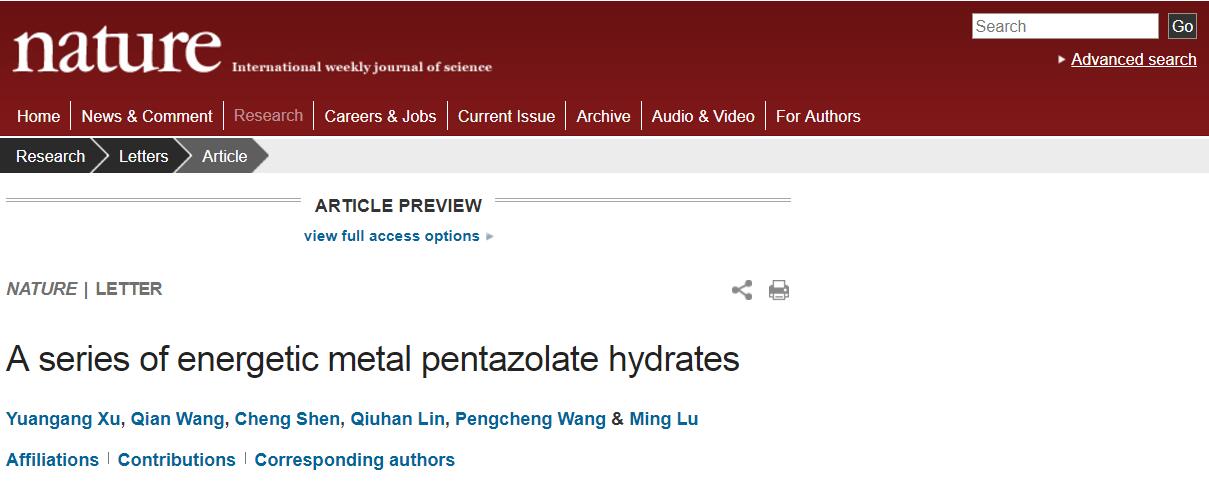 8月28日,我校2015届优秀毕业生许元刚(现为南京理工大学化工学院博士研究生)以共同第一作者身份在国际顶尖学术杂志《自然》(Nature,IF:40.14)主刊发表了高水平论文: A series of energetic metal pentazolate hydrates(系列水合五唑金属盐含能化合物。Nature,2017,DOI:10.1038/nature23662),这是我国首次在(Nature)发表含能研究领域基础科学论文,也标志着我国在含能材料基础研究的一些领域已经处于国际前沿。