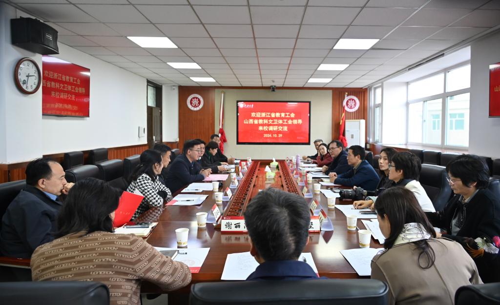 10月29日下午, 浙江省总工会二级巡视员、省教育工会主席王玉庆,山西省总工会副主席、省教科文卫体工会主席李忠贵等人来校调研交流。双方座谈会在德怀楼第四会议室召开。会议由校党委副书记赵文军主持。