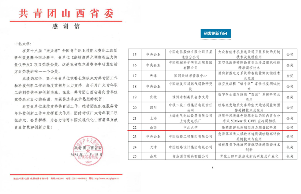 11月5日,由共青团中央、人力资源社会保障部主办的第十八届“振兴杯”全国青年职业技能大赛职工组创新创效竞赛在重庆举行。我校电气与控制工程学院青年教师李克武申报的项目“高精度弹光调制型应力测量仪研发”斩获金奖。这是我校首次在该赛事上荣获金奖。也是我省在本届赛事研发创新方向获得的唯一金奖。半导体与物理学院白建东老师申报的项目“基于人工智能的宽屏高动态光纤振动传感技术”获国赛优胜奖、省赛一等奖!同时,我校收到了共青团山西省委的感谢信,信中充分认可并赞扬了我校在科技创新工作中的杰出贡献,并表示衷心的感谢。