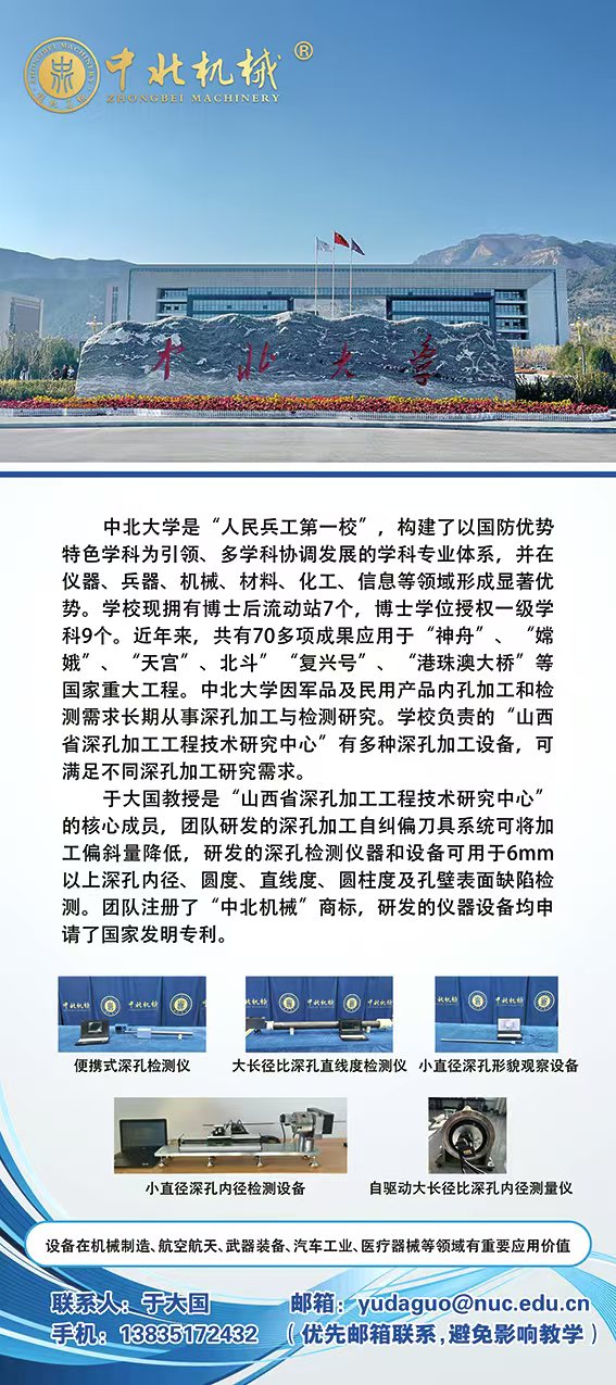 我校长期从事深孔加工与检测研究,学校牵头负责的山西省深孔加工工程技术研究中心有教师、研究生多人,取得了多方面成果。此次参展仪器包括小直径深孔形貌观察仪器、小直径深孔内径检测仪器、大长径比深孔直线度检测仪、便携式深孔检测仪、自驱动大长径比深孔内径检测仪。检测仪器可用于6mm以上深孔内径、圆度、直线度、圆柱度及孔壁表面缺陷检测,在机械制造、航空航天、武器装备、汽车工业、医疗器械等领域有重要应用价值。