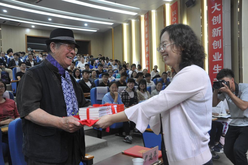 简短的赠书仪式后,演讲正式开始。彭教授以当代大学生的生活方式和恋爱观为切入点,通过分享烽火年代革命先烈保家卫国不怕牺牲的英雄事迹,告诫大学生要珍惜大学时光,珍惜青春年华,将无限的激情投入到实现梦想的征程中去,莫要过度沉溺于男女感情而荒废了学业,徒留“老大徒伤悲”式的凄凉。通过分享毛泽东主席身处病榻但仍坚持读书的故事,希望当代学子能够做到终生学习。通过分享自己儿时流浪的苦难经历以及坎坷人生路上所遇到的一个个好心人,彭老表达了自己从中体悟到的那一份无愧于国家、无愧于人民、无愧于社会的强烈责任感。