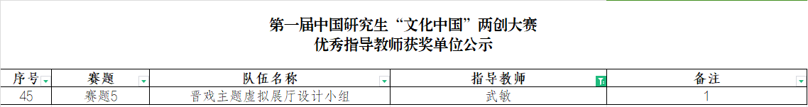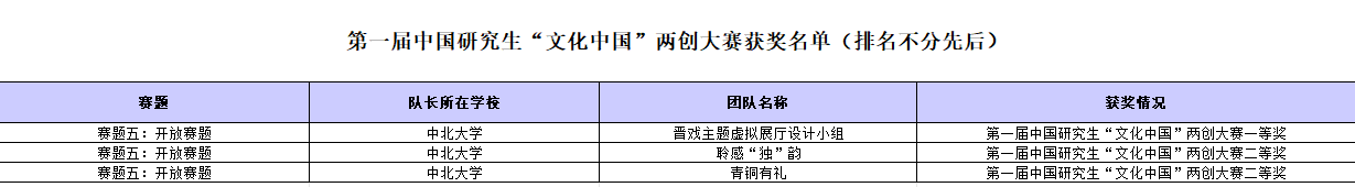 第一届中国研究生“文化中国”两创大赛2024年11月在山东大学举行。大赛评选结果于日前揭晓。来自全国442所高校的3030支队伍参赛,其中197支队伍入围决赛,最终51支团队荣获一等奖。我校艺术学院刘昌骐、秦欢同学作品“晋戏主题虚拟展厅设计小组”(指导老师:武敏)喜获全国一等奖。我校也是山西省唯一获全国一等奖的高校。武敏获评“优秀指导教师”,由其指导的另外两支团队荣获全国二等奖。