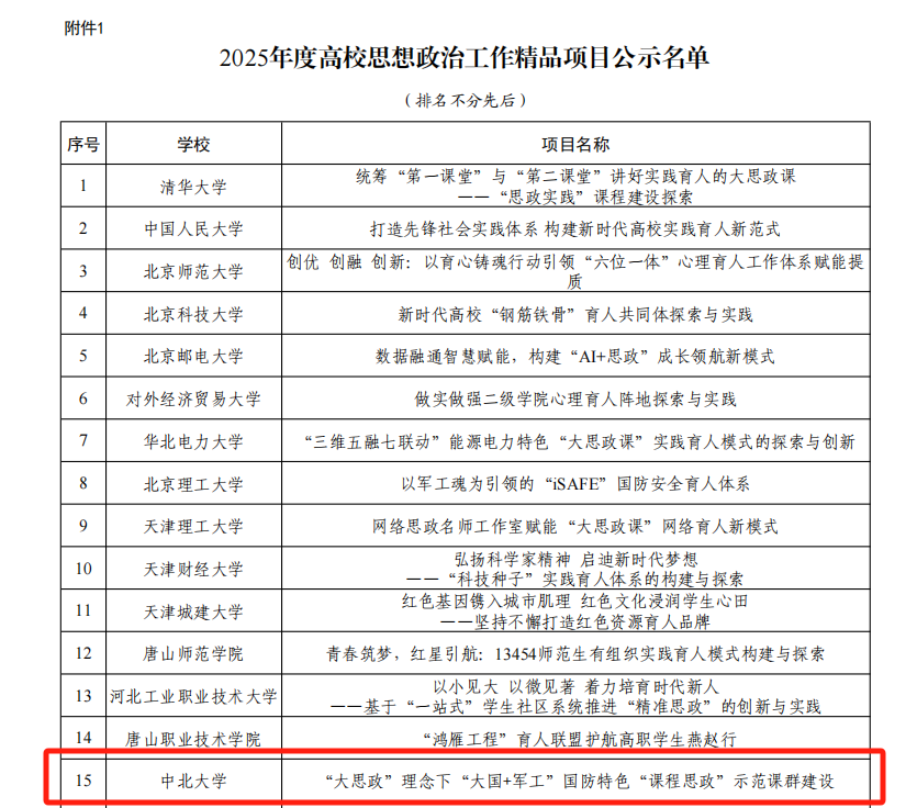 近日,教育部公布了《2025年度高校思想政治工作质量提升综合改革与精品建设项目遴选结果公示》,我校尹建平教授团队申报的《“大思政”理念下“大国+军工”国防特色课程思政示范课群建设》成功入选思想政治工作精品项目(全国共100项)。这是我校在该项目领域的第3次入选,标志着我校在推进新时代高校思想政治工作改革和构建国防育人特色体系中取得新突破。
