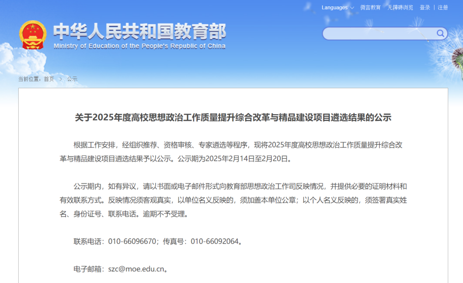 据悉,教育部从2019年正式启动高校思想政治工作质量提升综合改革与精品建设项目的遴选工作。其中高校思想政治工作精品项目每年立项100项,旨在深入贯彻落实习近平新时代中国特色社会主义思想,充分发挥“十大育人”体系的功能,进一步推动高校落实立德树人根本任务,支持各高校探索建设可示范、可引领、可辐射、可推广、可持续的思想政治工作品牌项目。