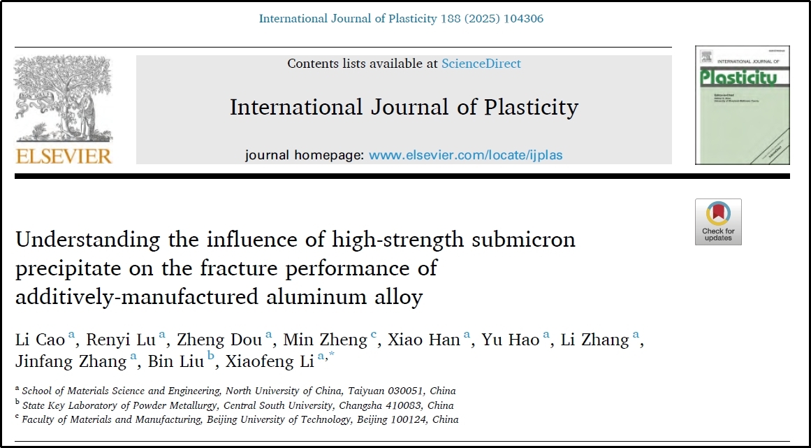 近日,我校材料科学与工程学院李晓峰教授团队以中北大学为第一通讯单位,联合中南大学、北京工业大学在国际期刊《International journal of Plasticity,简称IJP》发表科技论文“Understanding the influence of high-strength submicron precipitate on the fracture performance of additively-manufactured aluminum alloy”。IJP是材料科学与塑性力学领域的国际权威顶级期刊,期刊聚焦于固体材料塑性变形、损伤与断裂行为的基础理论与应用研究。论文第一作者为我校材料学院青年教师曹利博士,毕业于北京工业大学,于2024年以人才计划引进到材料学院。李晓峰教授为本论文的唯一通讯作者,长期从事特种铝合金、高熵合金和硬质合金等材料的粉体制备与增材制造成形技术及机理研究,近年来获得多项省部级科技奖励及荣誉称号。