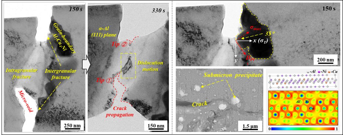 论文通过采用先进的原位/非原位电镜表征技术、结合仿真模拟和理论计算,探索了铝合金从激光增材制造成形、后处理至拉伸断裂失效过程中的组织演变规律,揭示了高强度亚微米尺度析出相对位错运动和裂纹演化的影响机制,建立了铝合金“制造过程-组织特征-断裂行为”之间的影响机制理论框架,为激光增材制造铝合金的微观组织调控和强韧性能匹配提供了理论支撑和直接性证据。