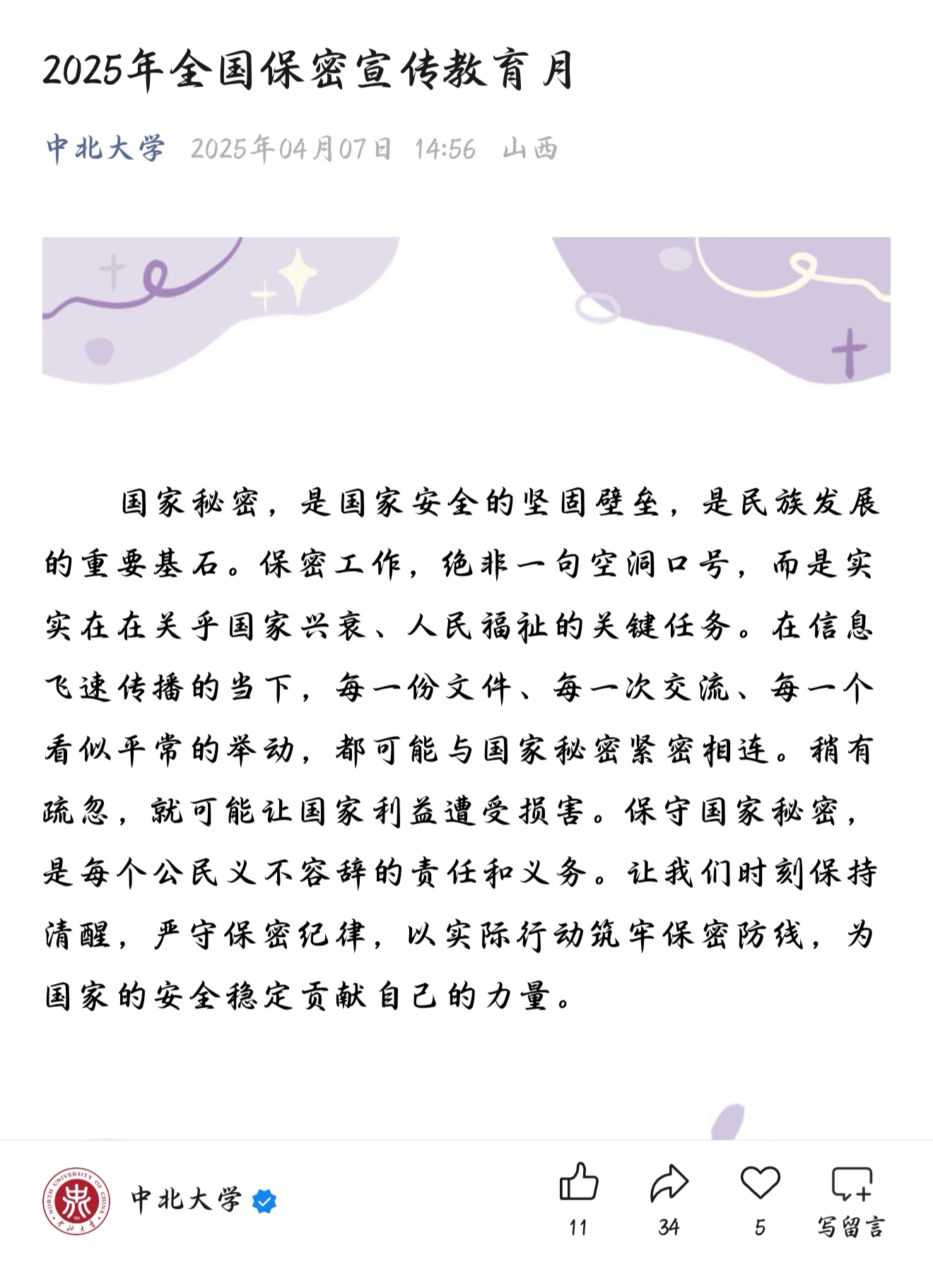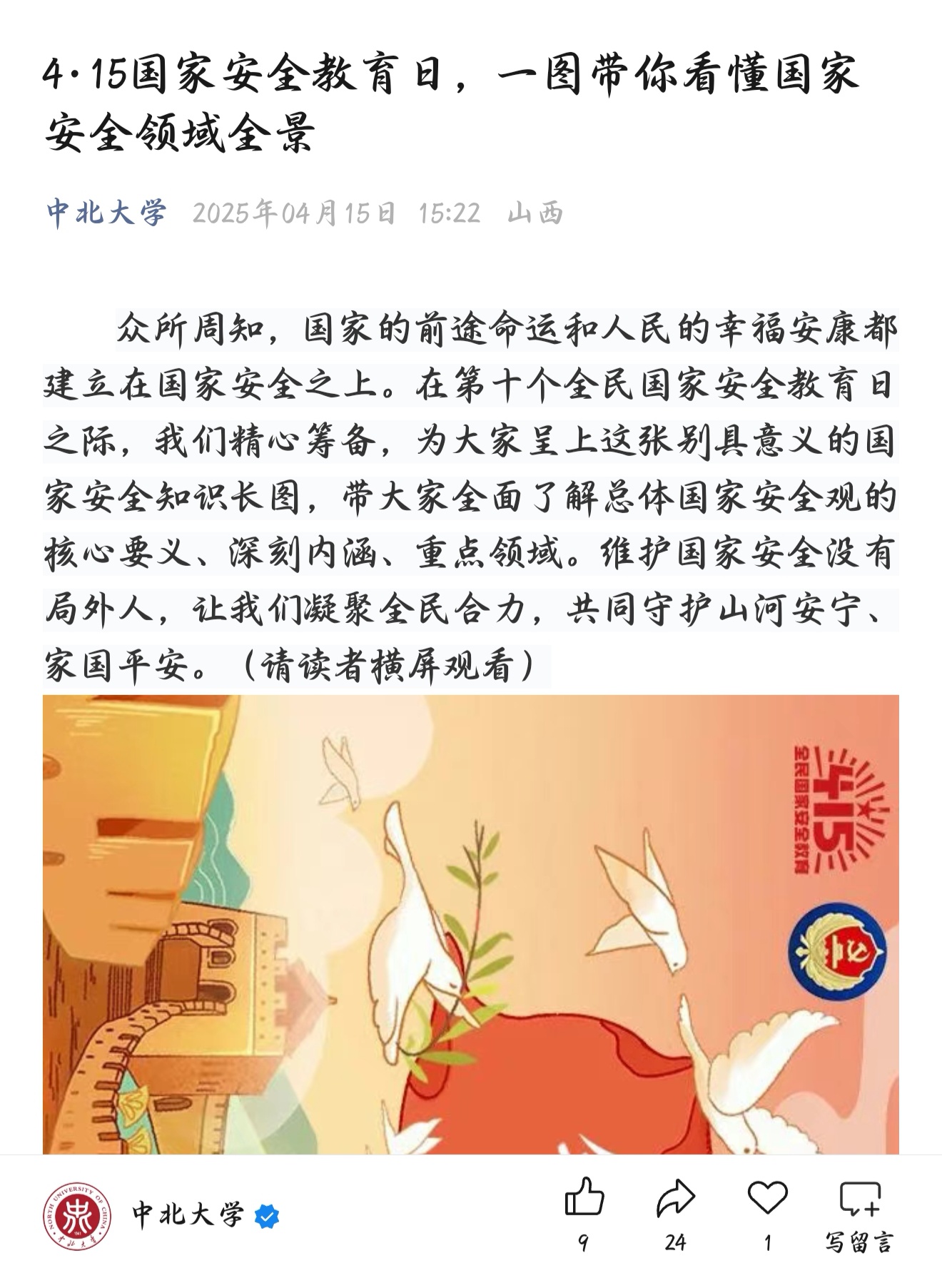 党委宣传部通过校园网主页刊发国家宣传日系列活动报道,全景式展现我校深入贯彻总体国家安全观的动态;通过官微推送《4·15国家安全教育日,一图带你看懂国家安全领域全景》,带领大家全面了解总体国家安全观的核心要义、深刻内涵和重点领域。保密办在中北大学微信公众号推出保密公益宣传片《指尖的守护》及保密公益宣传海报,并在学校主干道张贴多张保密公益宣传海报,通过“保密观”“中国保密在线”对在岗涉密人员开展线上保密教育培训及考试,通过微信工作群推送“国家安全部”官方发布的典型案例,向各涉密单位发放《中华人民共和国保守国家秘密法实施条例》等保密教育书籍200余册,在学校中央大道厨窗栏展出《中华人民共和国保守国家秘密法实施条例》,为构建全方位、多层次的保密工作体系,增强全校师生保密意识,筑牢安全保密防线奠定了坚实基础。安全保卫部在中央大道展出国家安全教育知识展板10块,在校内主要干道路口悬挂宣传条幅30条,致力打造“行走的安全课堂。”