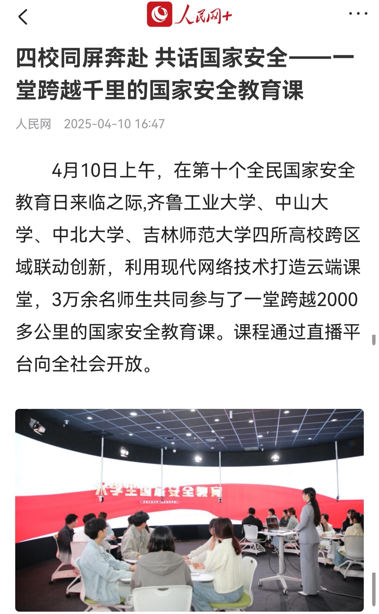 齐鲁工业大学、中山大学、中北大学、吉林师范大学四所高校跨区域联动创新,利用现代网络技术打造云端课堂,3万余名师生共同参与了一堂跨越2000多公里的国家安全教育课。课程通过直播平台向全社会开放。课程采用“沉浸式教学+云端辩论”新模式,通过课堂连线,展示了总体国家安全观的主要内容以及当前国家安全面临的威胁与挑战等,并以《哪吒》电影和大学生主题获奖作品为例,讲述青年学子如何维护国家安全。人民网以《四校同屏奔赴 共话国家安全——一堂跨越千里的国家安全教育课》为题进行了报道。这堂云端国家安全教育课借助技术的力量进行异地同屏教学,以沉浸式的虚拟场景打造新课堂,让网络安全、反间谍等抽象概念变得直观可感,增强了学习的互动性和体验感。