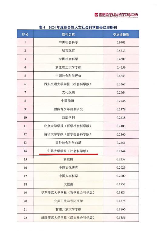 该报告对我国606种综合性人文社会科学期刊的阅读指数、下载指数与受欢迎指数进行计算统计,并按照受欢迎指数排序后,展示前10%的61种综合性人文社会科学最受欢迎期刊,《中北大学学报(社会科学版)》排在第14位,受欢迎指数为0.2244。
