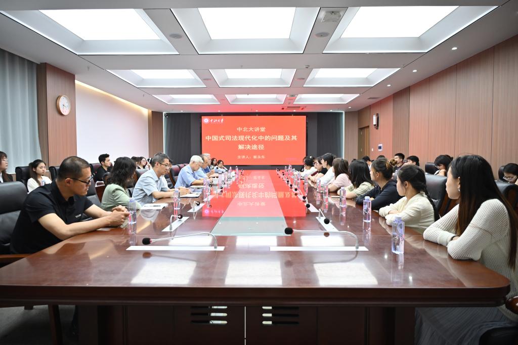 6月9日,“中北大讲堂——中国式司法现代化中的问题及其解决途径"专题讲座在瑾瑜会议中心第五会议室举行。山东大学法学院特聘教授、司法学研究中心主任崔永东应邀主讲,校党委书记张晓永、副书记赵文军出席讲座。民盟中央原副主席、全国人大宪法和法律委员会原副主任、甘肃省人民政府原副省长李重庵与人文社会科学学院、马克思主义学院相关负责同志,来自我校法学背景的相关教师、中北大学法治服务双创平台、法律服务协会和“晋青法学+”普法志愿服务队的学生代表聆听讲座。副书记赵文军主持讲座。
