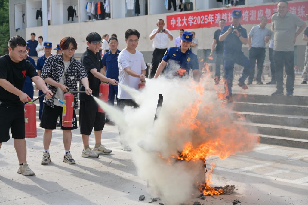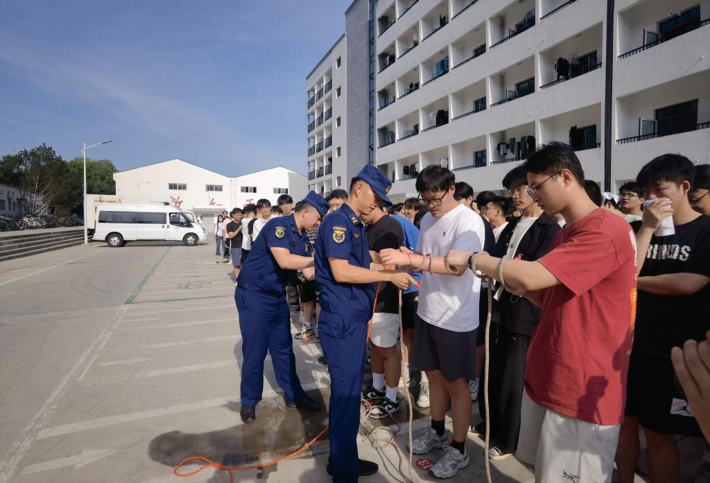 随着总指挥宣布演练开始,文韬 8 号学生公寓216宿舍模拟起火场景,浓烟弥漫间,疏散演练活动即刻展开。学生们在辅导员引导下,弯腰捂鼻,沿安全通道有序撤离,成功完成紧急疏散。随后消防大队消防员全流程完成被困学生救援实操。疏散、救援演练结束后,尖草坪区消防大队消防员化身 “安全导师”,细致讲解消防知识,现场示范灭火器、防毒面罩、消防栓的正确使用方法,演示结绳缓降技巧,并进行消防车喷水展示。校医院医护人员现场带来专业的心肺复苏操作讲解和演示,让安全知识可学可感。
